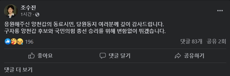이번 경선에서 패배한 조수진 의원은 경선 결과를 받아들이며, 양천갑 후보와 국민의힘의 총선 승리를 위해 계속해서 노력하겠다는 의지를 페이스북을 통해 밝혔습니다.