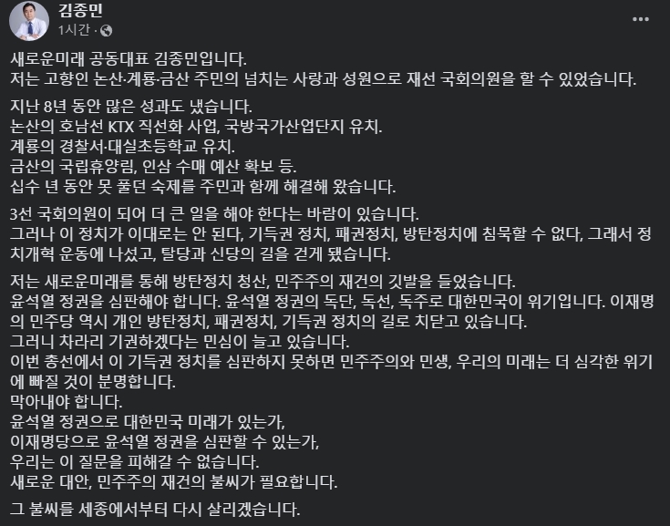 새로운미래 공동대표 김종민 의원이 세종시 갑 지역구 출마를 공식 선언했습니다.