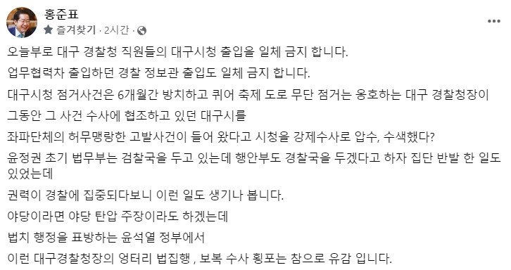 결국 홍준표 시장은 대구 경찰청 직원들의 대구시청 출입을 일체 금지한다고 선언하였습니다.