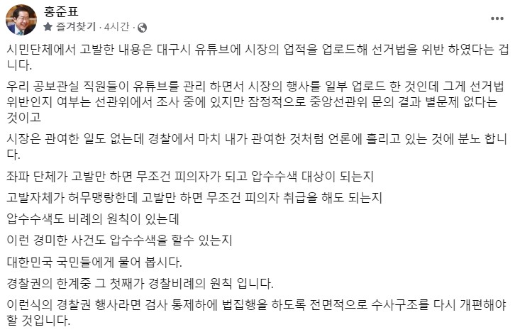 홍 시장은 자신의 페이스북을 통해 선거법 위반에 대한 고발이 이루어진 상황에서 선관위에서의 조사가 진행 중임에도 압수수색이 이루어진 것을 문제 삼았습니다. 그는 고발이 들어오면 아무런 조사 없이 바로 압수수색이 이루어진다며 이는 경찰이 아니라 깡패의 행동이라고 비판했습니다.