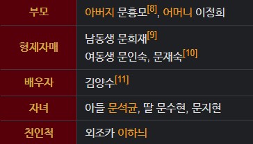 가족관계로는 아버지 문희상 전 국회의장과 어머니 김양수, 두 명의 여동생이 있으며, 배우자와 두 자녀를 두고 있고, 배우 이하늬는 그의 고종사촌입니다.